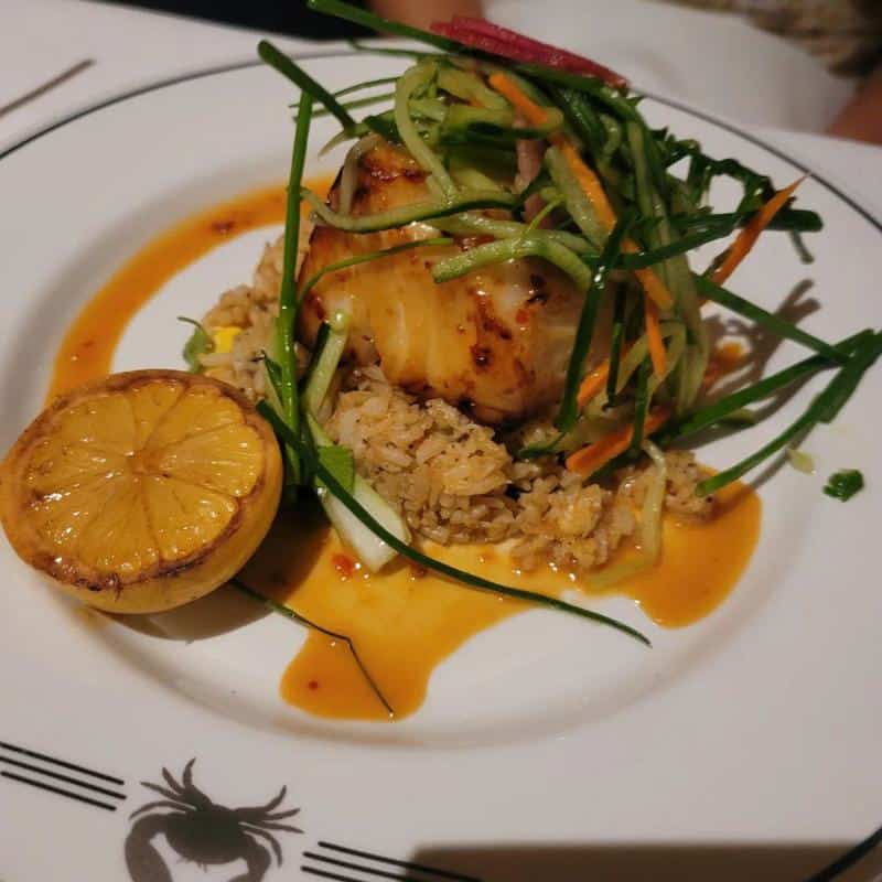 I recommend you start by ordering the Caesar Salad with creamy dressing and an appetizer like the crispy calamari. Baked Halibut is a great entrée served over asparagus and barley. Have a taste of the house favorite hula pie for dessert with chocolate cookie crust and macadamia nut ice cream.
